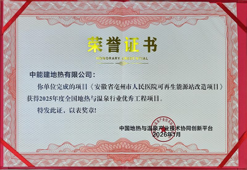近日,中能建地热有限公司应邀出席“2025地热产业企业家论坛暨联盟年会”。公司荣获“2025年度全国地热与温泉行业突出贡献单位”;公司自主研发的“地下储能系统首台(套)设备”荣获“2025年度全国地热能开发利用先进技术”奖;公司投建营项目——安徽省亳州市人民医院可再生能源站改造项目获得“2025年度全国地热与温泉行业优秀工程”奖。